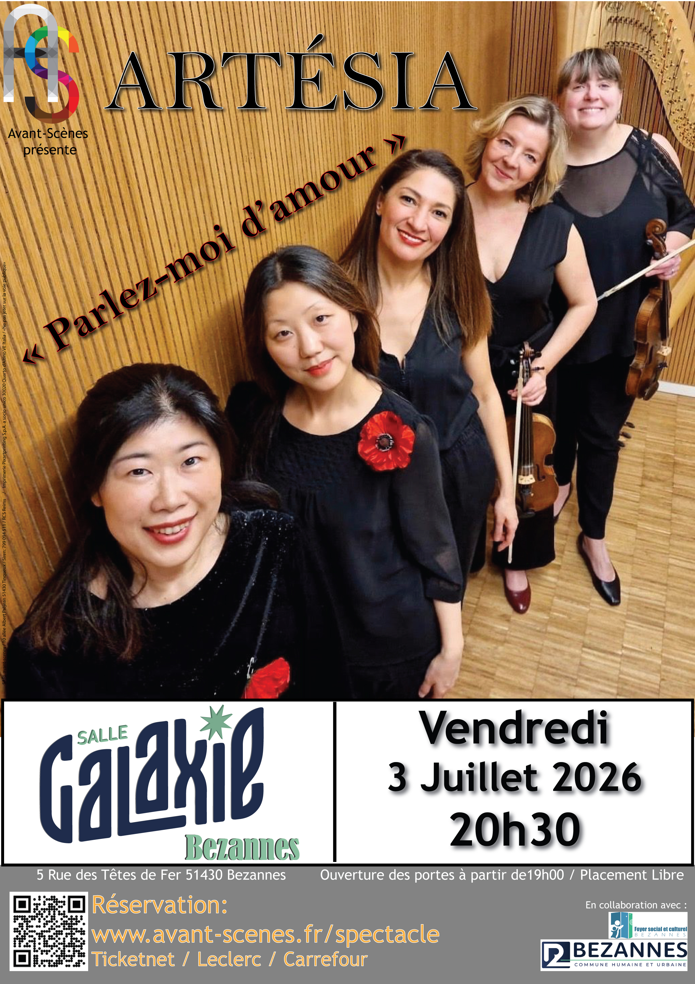 Artesia est un ensemble lyrique et musical (Chant-HarpePiano-Violons) qui s’est donné pour mission de décloisonner la musique classique et de la partager dans des lieux insolites avec tous les publics.